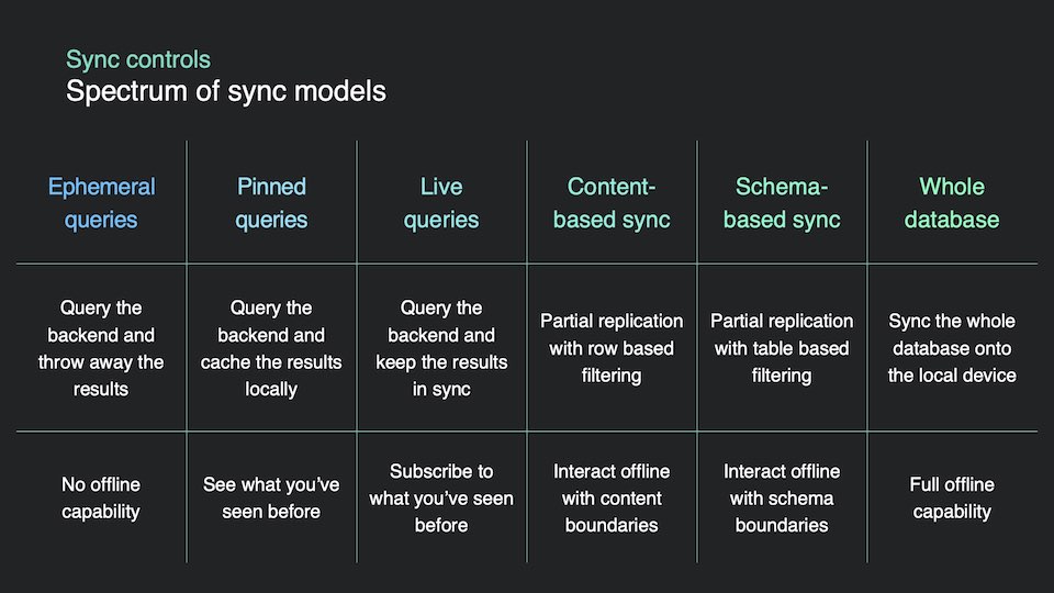When you're building local-first or offline-capable apps, there are a range of sync strategies you may choose to employ. From pinned queries to live subscriptions to row-based or schema-based filtering.