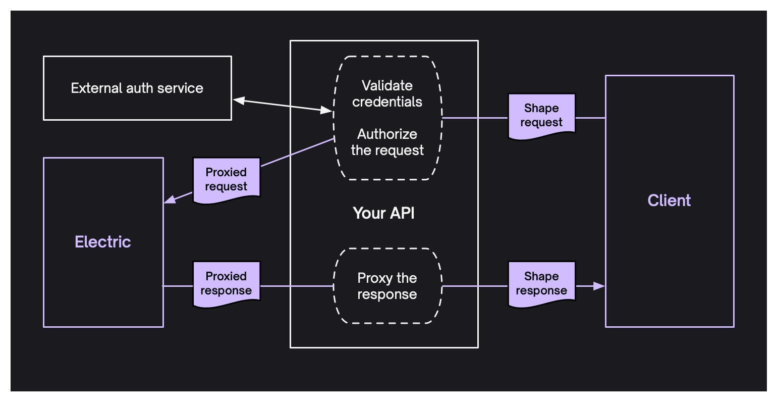 Note that with this pattern, if you need it to, the auth endpoint that proxies the request to the Electric shape API can call out to a seperate auth service. So if you need to integrate an external auth system, you can.
